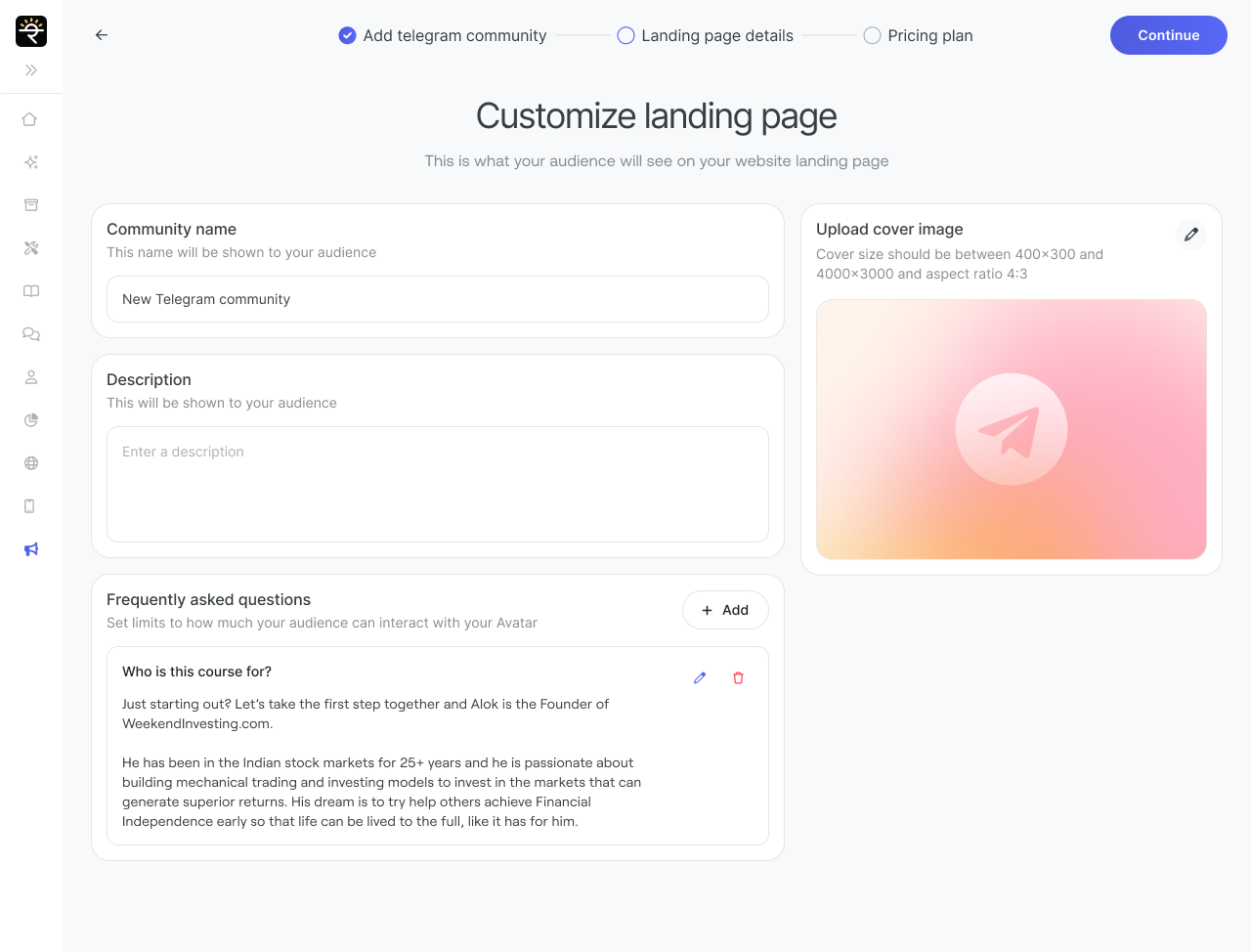 Frequently asked questions: Set limits to how much your audience can interact with your Avatar. Click "+ Add" to enter new questions and answers that help potential subscribers understand your community better.