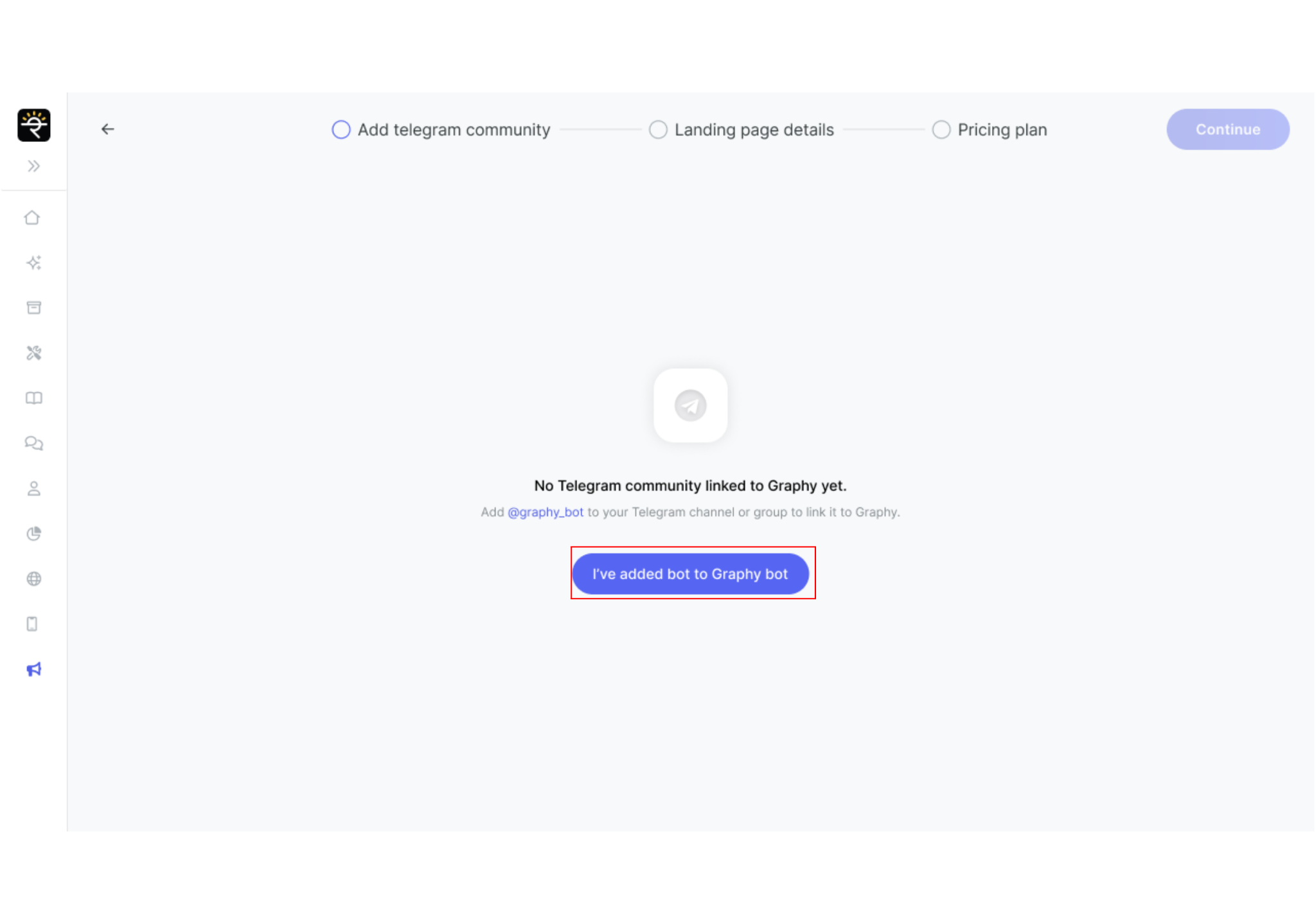 Once you have added @graphy_bot as an administrator in your Telegram groups or channels, click "I've added bot to Graphy bot" to continue.