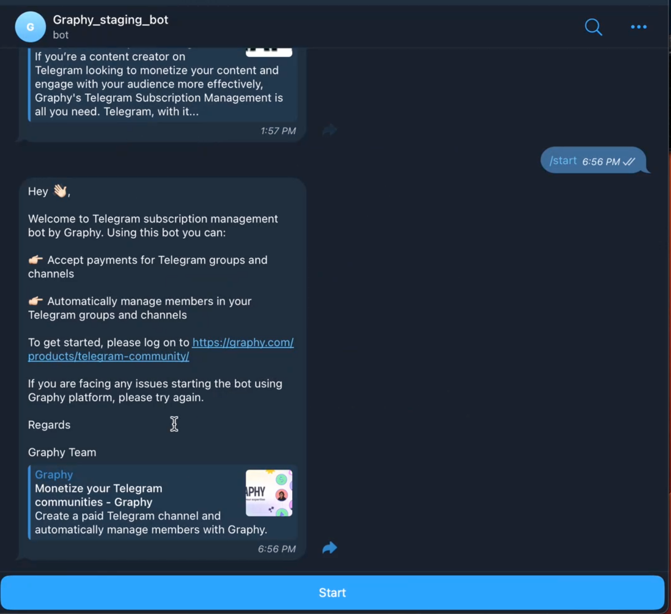 The bot will greet you with: "Hey ?, Welcome to Telegram subscription management bot by Graphy. Using this bot you can: