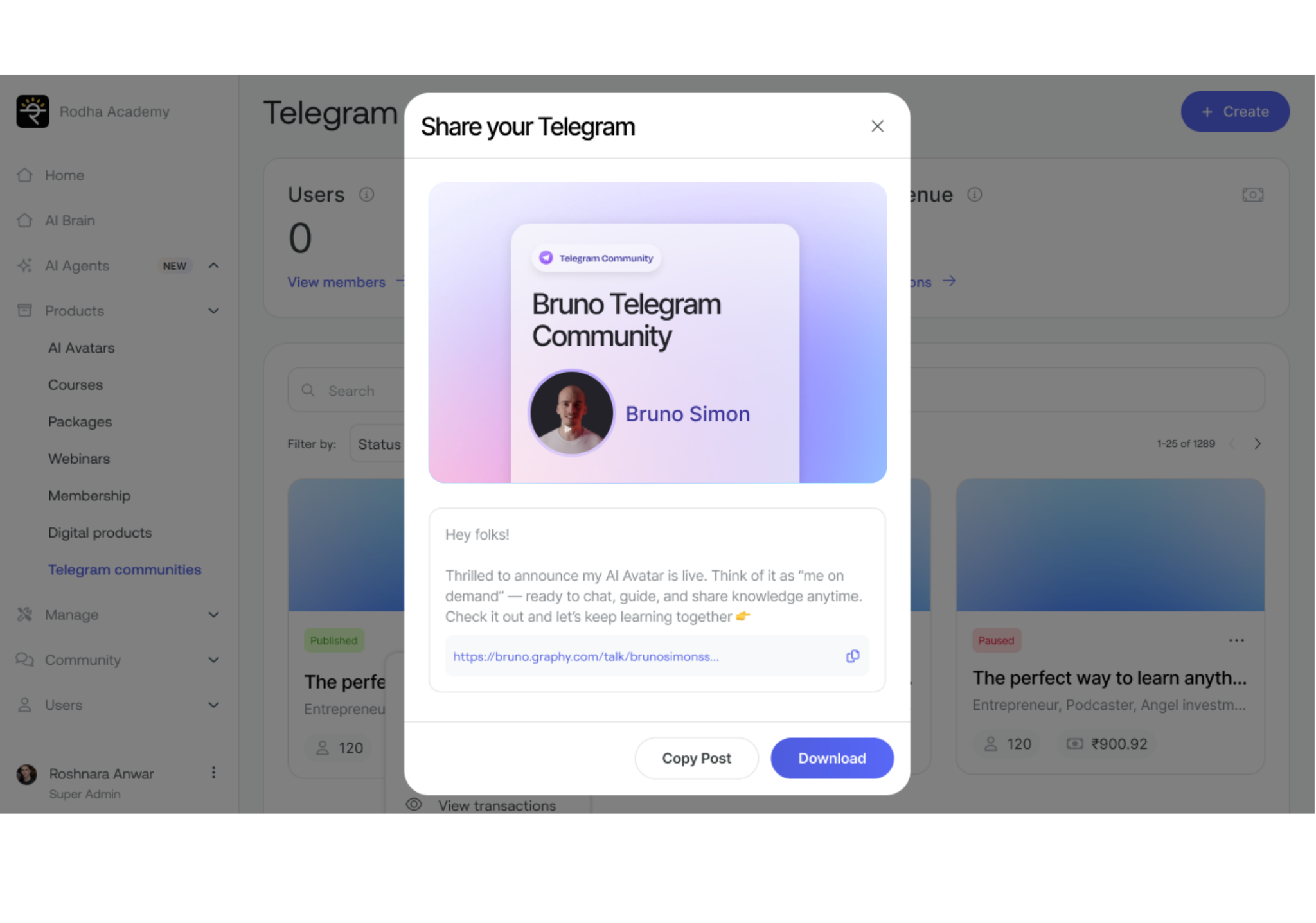 After publishing, a "Share your Telegram" popup will appear, allowing you to promote your community. The share screen displays your community preview card with your name and branding, a pre-written promotional message, your unique community link, "Copy Post" button, and "Download" button.