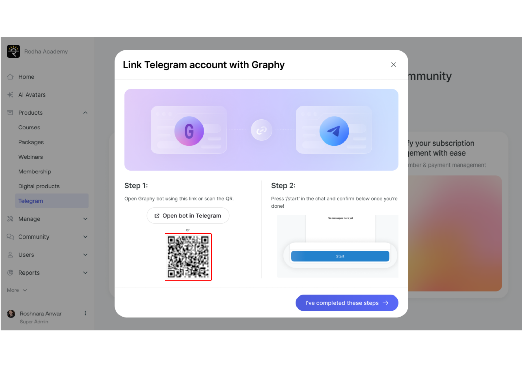 Type '/start' in the chat to initiate the connection. Then click "I've completed these steps" in the Graphy platform to proceed.