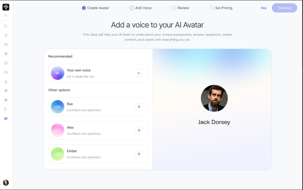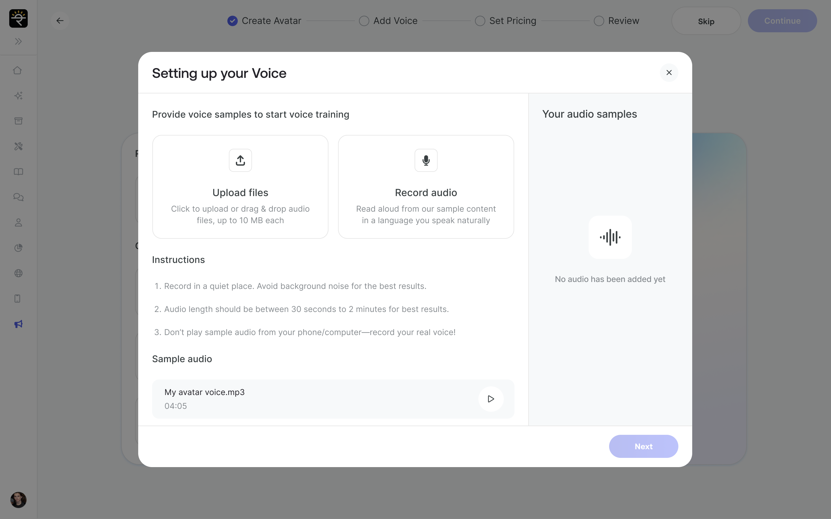 Option 3: Click "Skip" if you want to add voice later. If you’re not ready now, your avatar will still work through text.