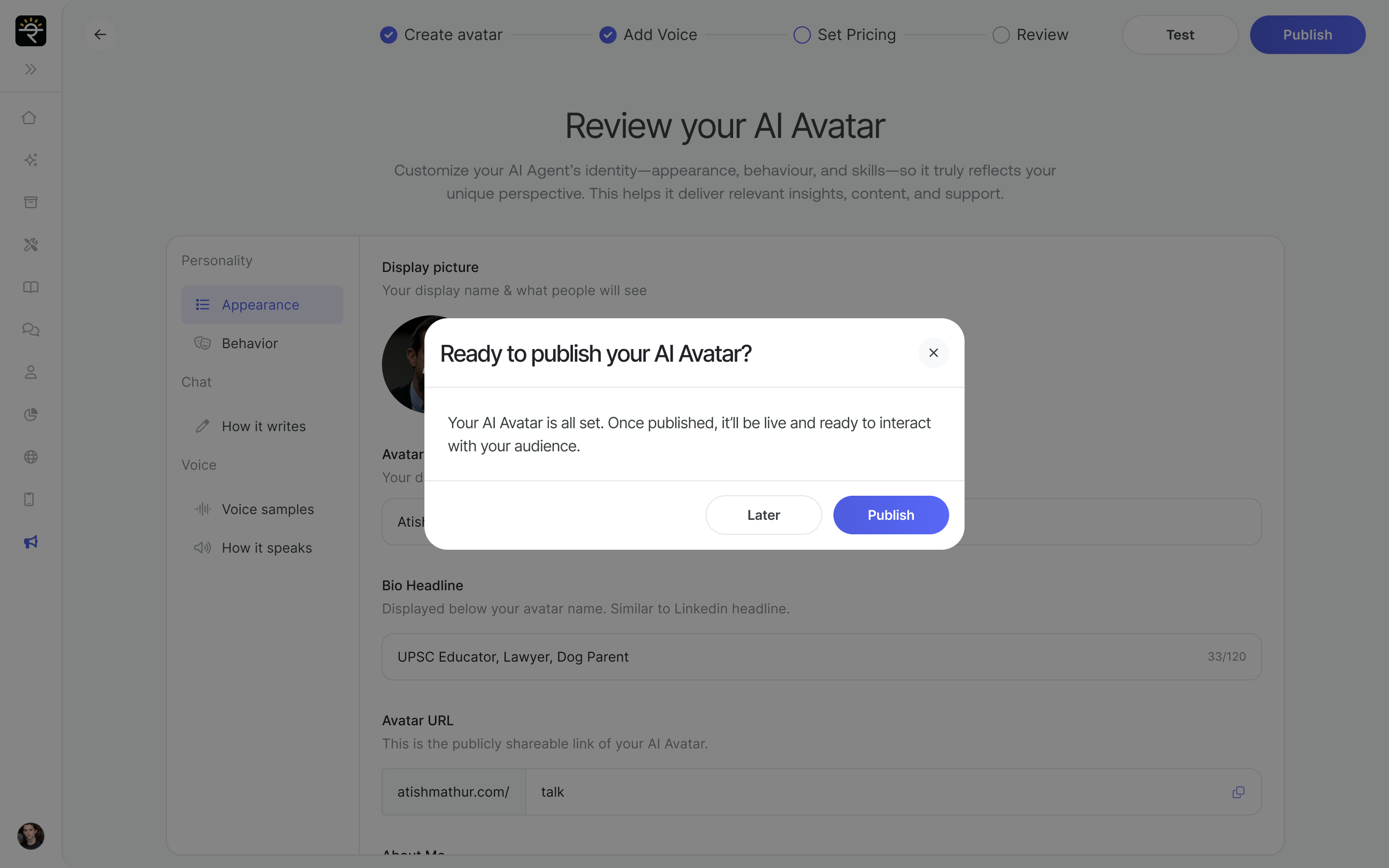 Step 7: Once you’ve reviewed all settings and ensured your Avatar is ready, click Publish to activate it.