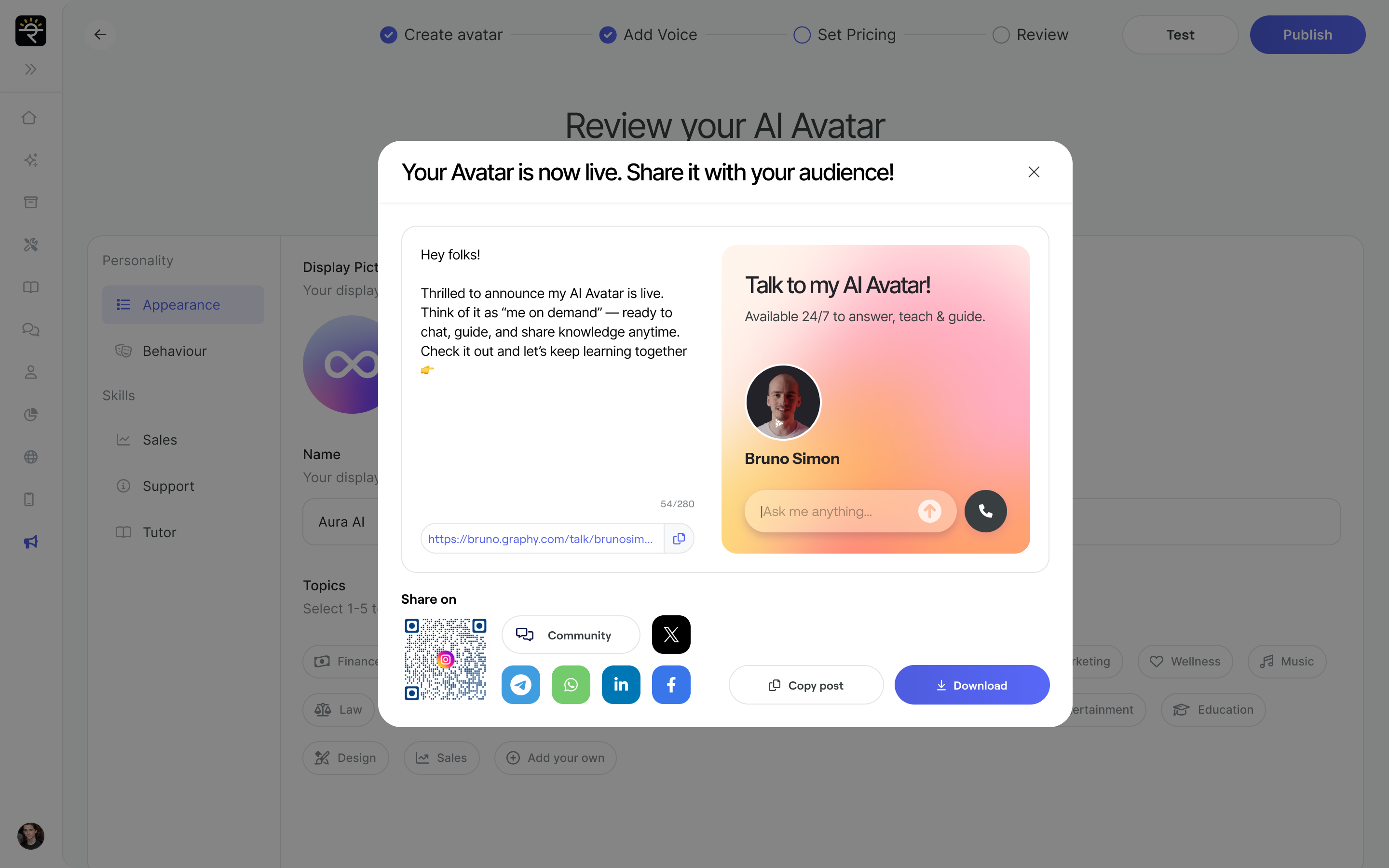 Adding a voice makes your avatar feel more human and engaging. Learners will not only read but also hear responses just like talking to you.