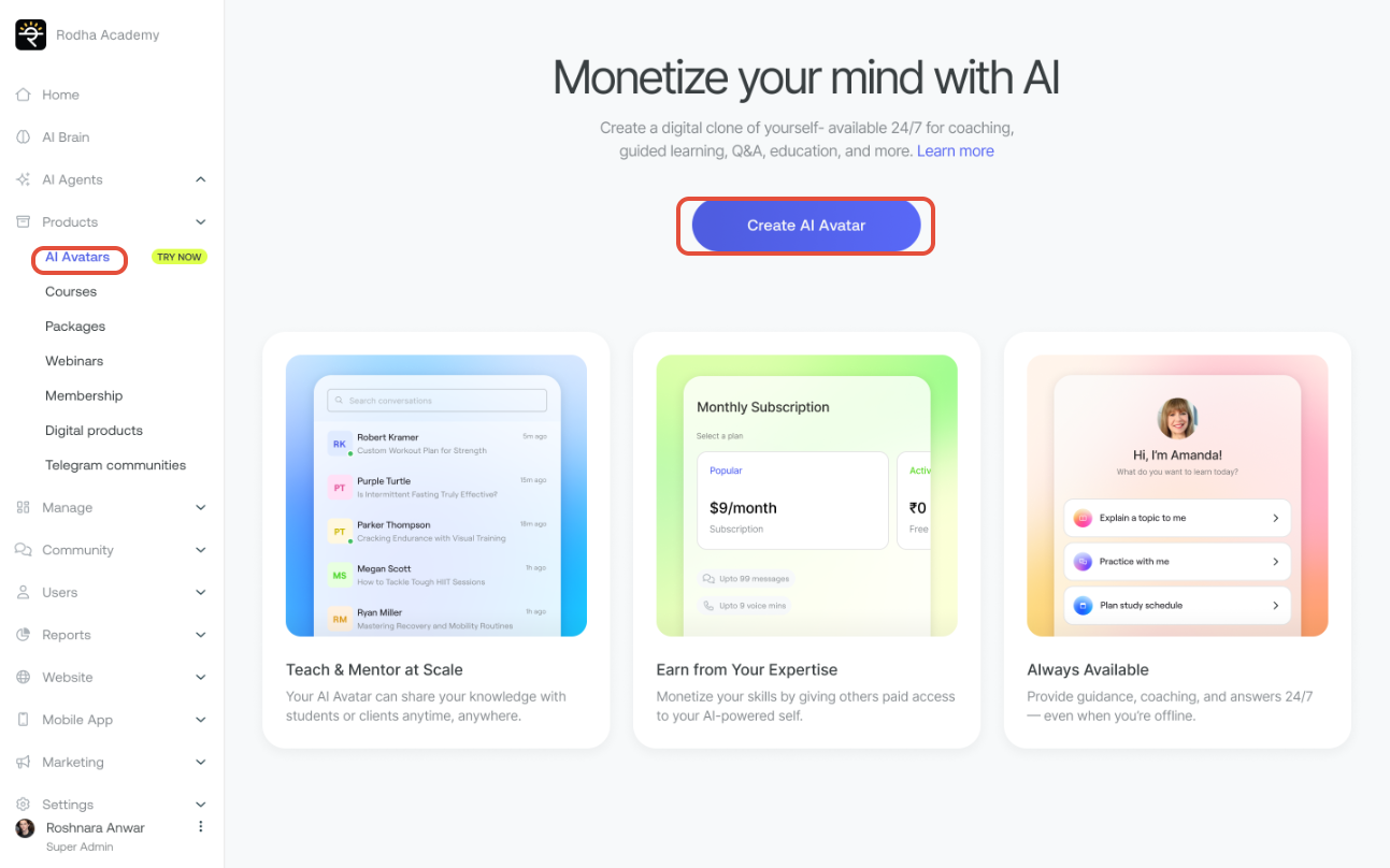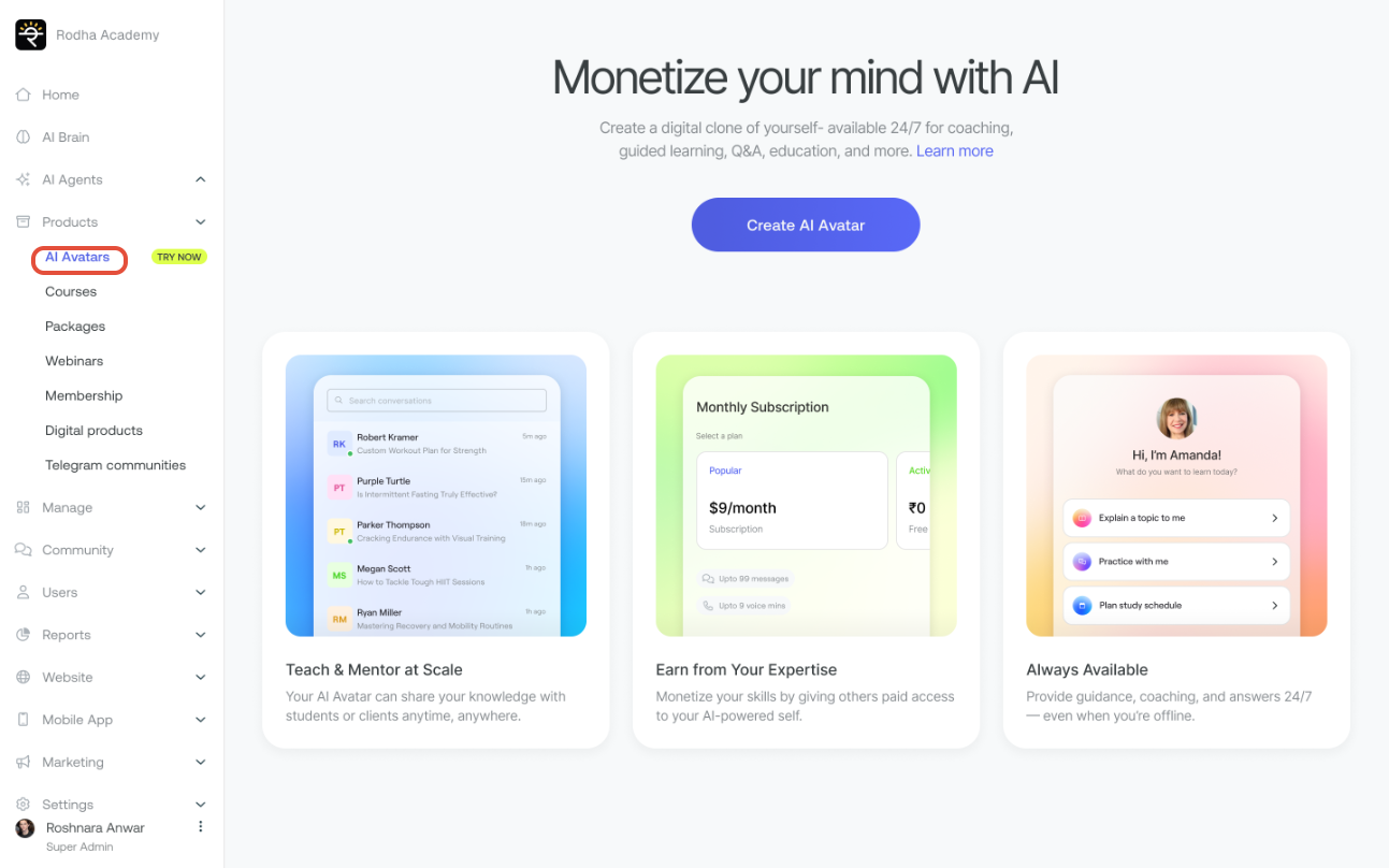 Step 1: Select Products from left navbar and click on AI Avatar.