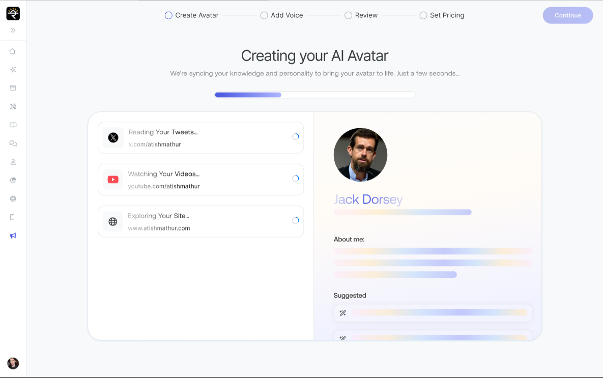 The avatar will look at the social handles and website you have added, pull out important details like your bio, work, skills, tone & style, and then automatically genarate a profile for you. You’ll be able to review and edit it before saving.