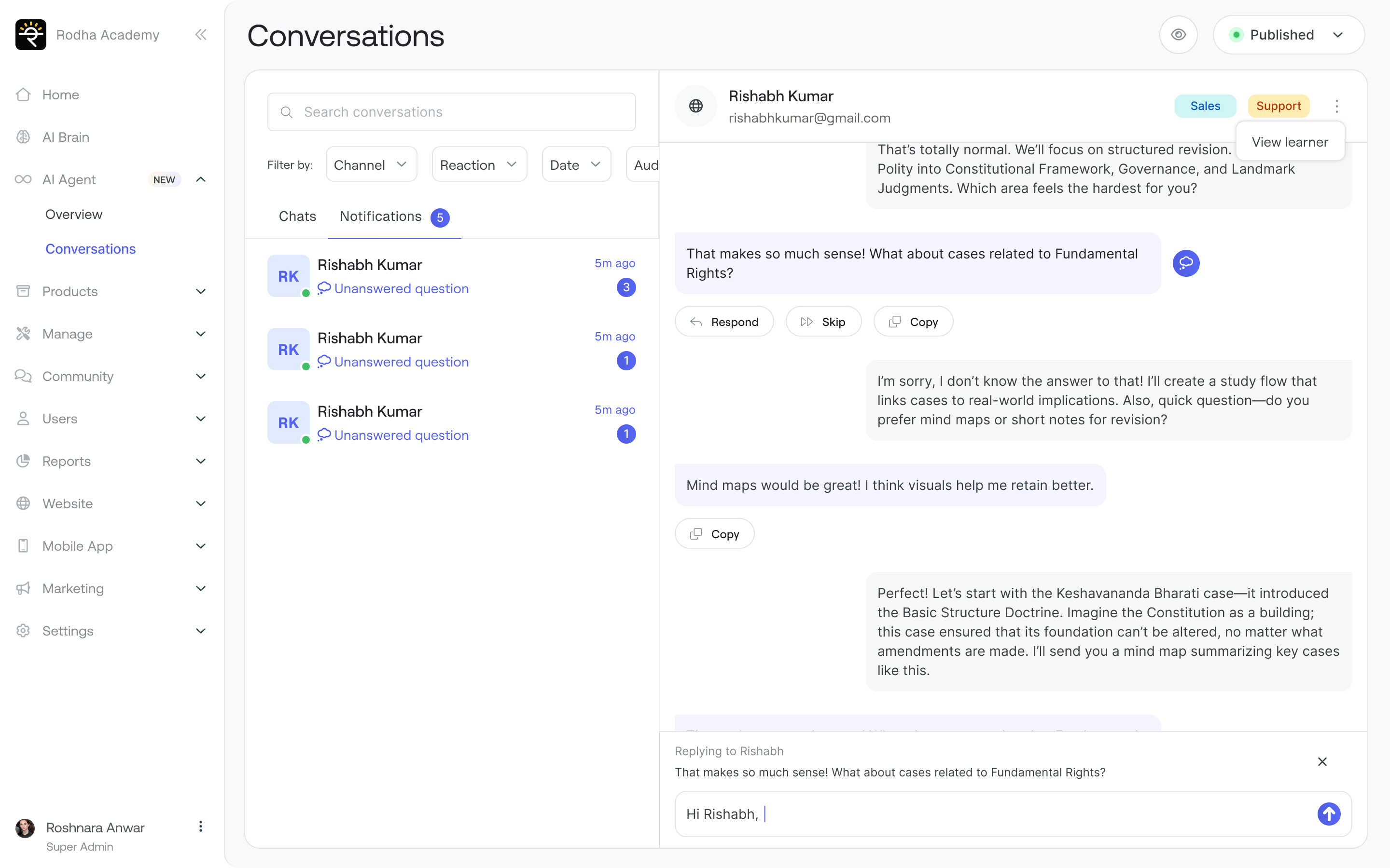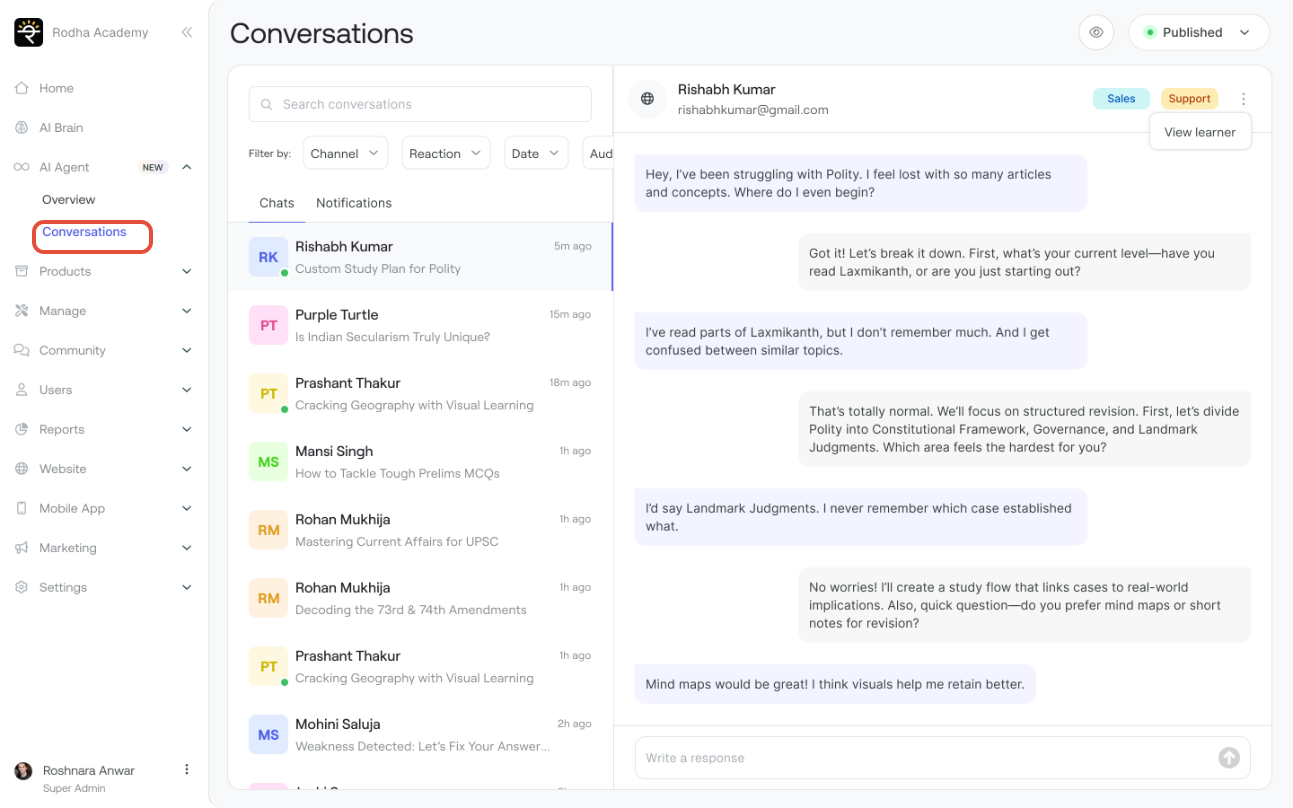 Your AI Agent engages with learners by providing answers to their queries. You can monitor and analyze all these interactions directly through the Graphy dashboard to maintain response quality and enhance overall performance.