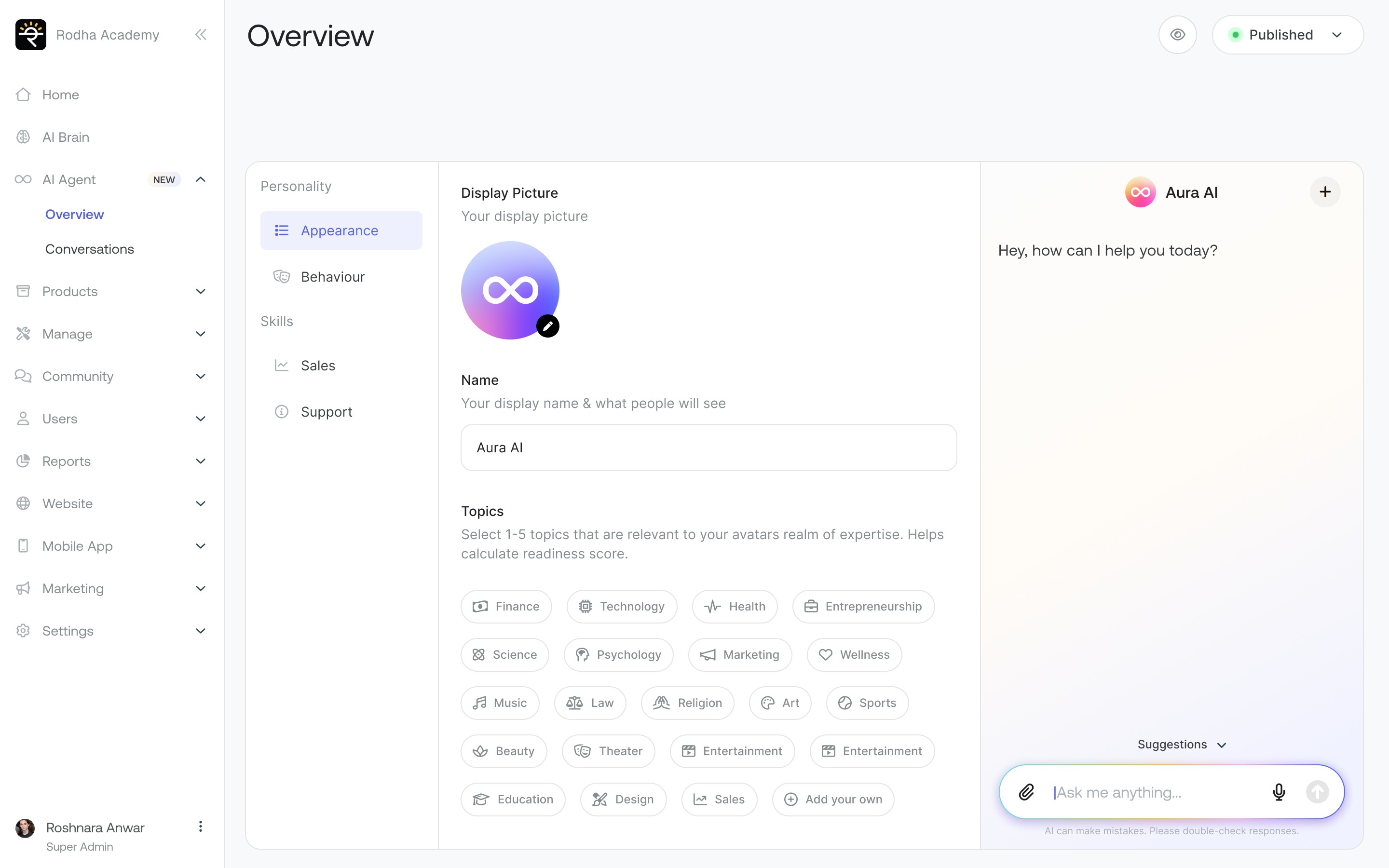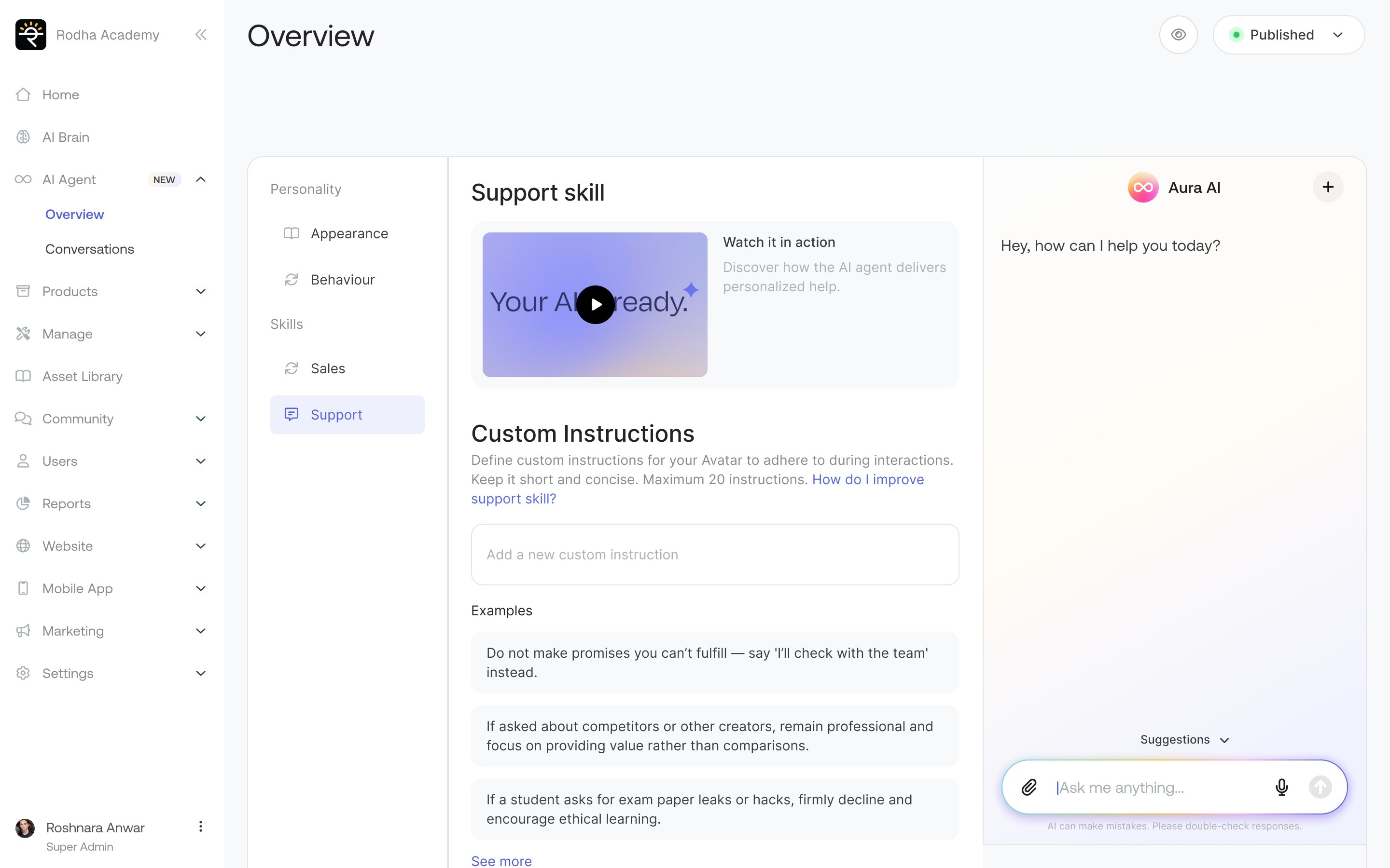 Your AI Agent's support skills determine how effectively it can help your learners, answer their questions, and enhance their learning experience. By customizing these skills, you can create a knowledgeable and helpful assistant that provides personalized support to your students 24/7.