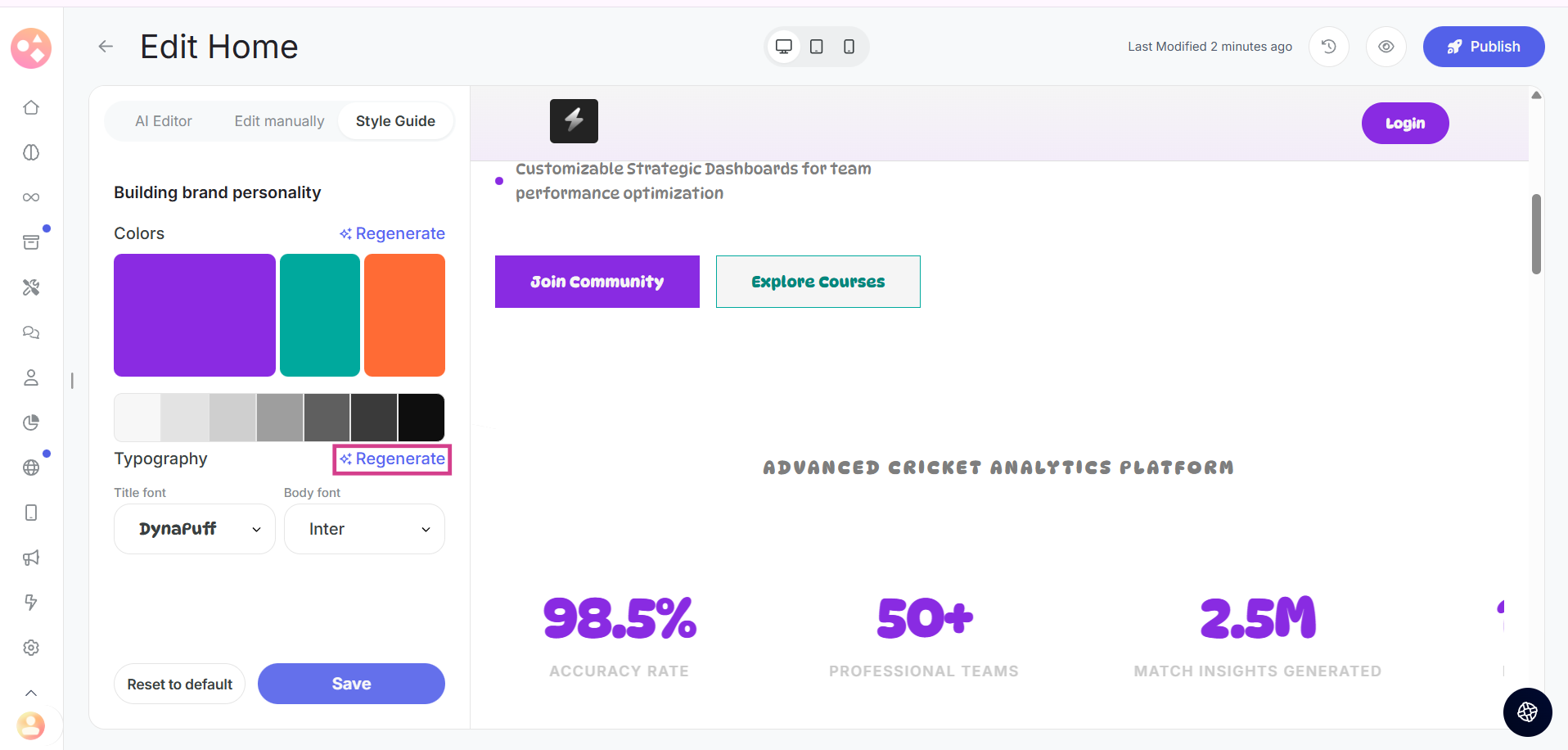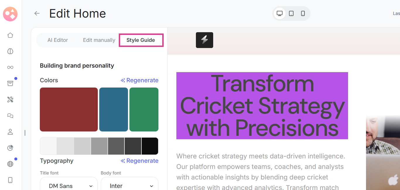 The Style Guide tab lets you transform your entire page's appearance by regenerating color schemes, experimenting with different fonts, and resetting to default styles. Make global design changes that affect your entire page aesthetic, try unlimited design variations, and maintain visual consistency across your website. This tab is perfect for quickly changing your page's mood and branding without touching individual elements.